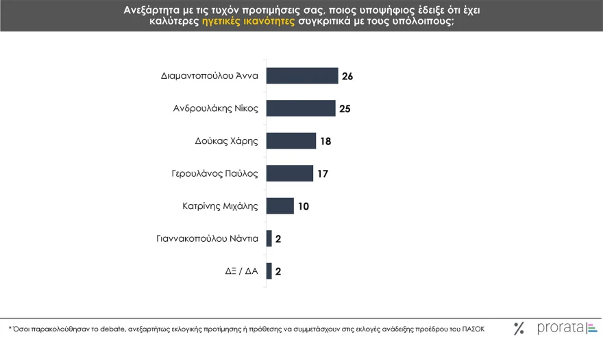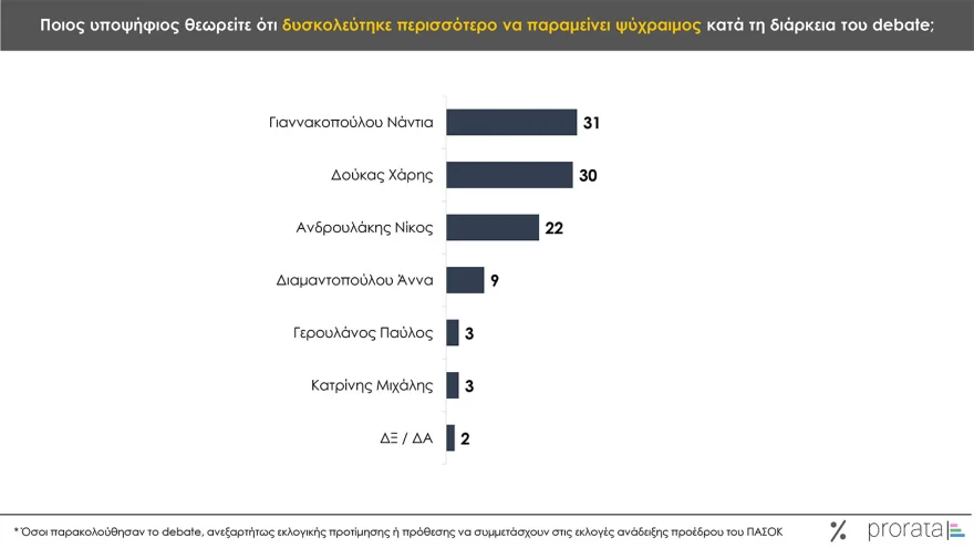Την ίδια ώρα τα νούμερα δείχνουν ενίσχυση του Παύλου Γερουλάνου, ο οποίος βγήκε αλώβητος από το debate και αναζητεί τον καταλύτη για να ανεβάσει τα ποσοστά του στην τελική ευθεία και να αντιμετωπίσει επί ίσοις όροις το προβάδισμα των άλλων υποψηφίων.
