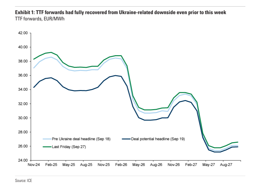 «Η κλιμάκωση των εντάσεων στη Μέση Ανατολή ενίσχυε τις τιμές του ευρωπαϊκού φυσικού αερίου κατά 5% ανά εβδομάδα σε πάνω από 38 ευρώ/MWh. Ωστόσο, οι ευρωπαϊκές προθεσμιακές τιμές φυσικού αερίου είχαν ήδη ανακάμψει μετά την είδηση μη συμφωνίας Ουκρανίας-Αζερμπαϊτζάν πριν από τα γεγονότα αυτής της εβδομάδας. Αυτό υποδηλώνει ότι η αγορά δεν έχει αλλάξει άποψη για τη διακοπή των υπόλοιπων ρωσικών ροών μέσω της Ουκρανίας μέχρι το τέλος του έτους.