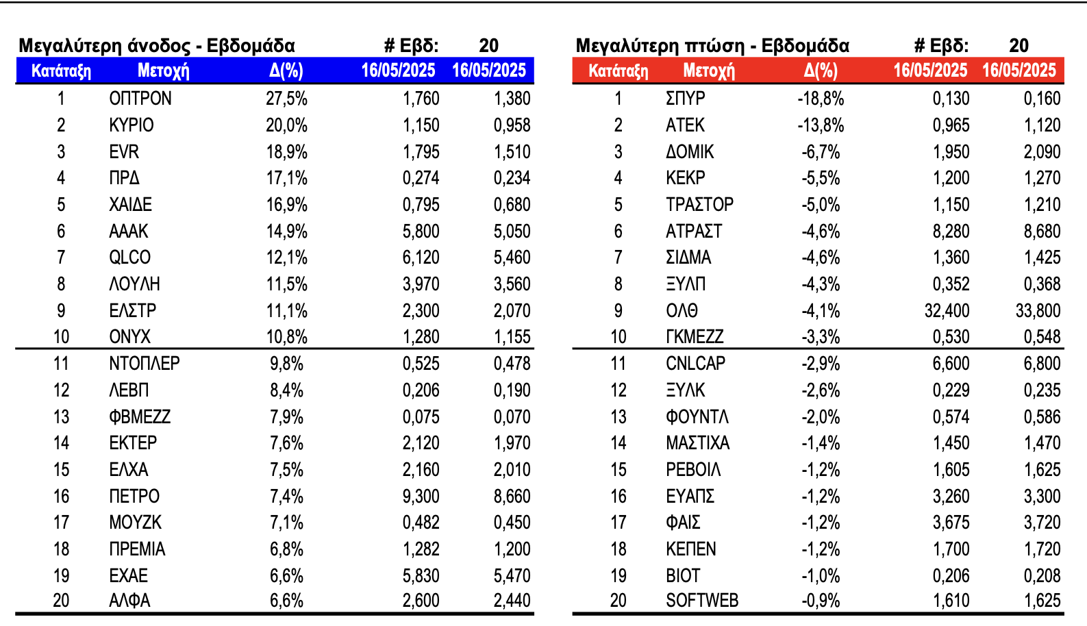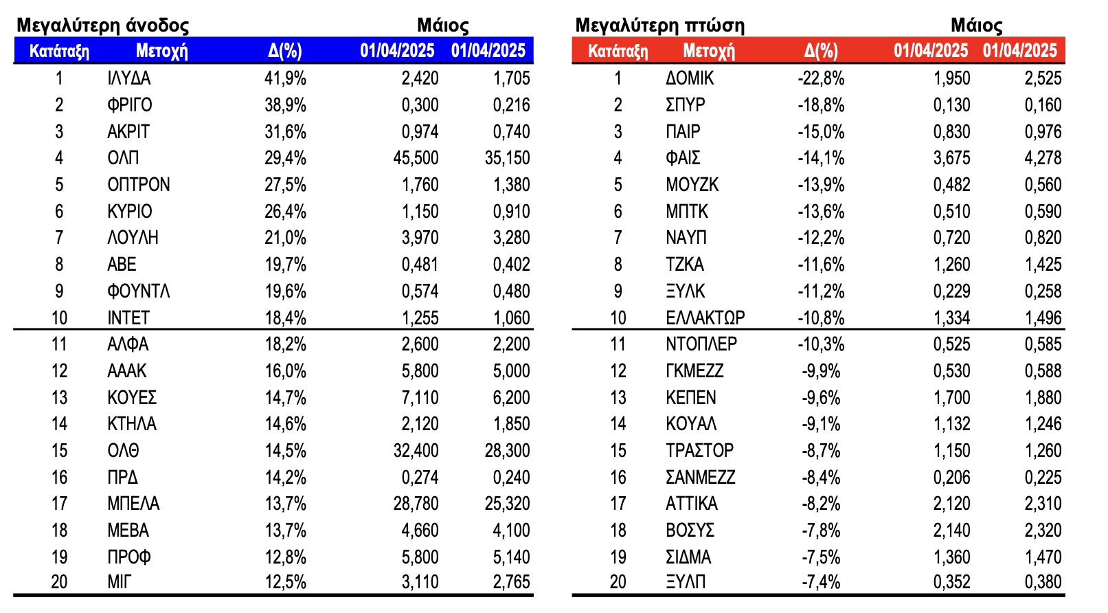 Στην ελληνική αγορά συνεχίστηκαν οι αγορές ιδίων από τον ΕΛΛΑΚΤΩΡΑ με 50000 μετοχές στις 16 Μαϊου και μέση τιμή τα 1,33 ευρώ, ενώ 21600 μετοχές με μέση τιμή 13,92 ευρώ, αγόρασε και η ΔΕΗ στις 14/5.