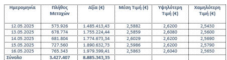 Η «Eurobank Ergasias Υπηρεσιών και Συμμετοχών Ανώνυμη Εταιρεία» («Eurobank Holdings»), σε συνέχεια της από 07.05.2025 ανακοίνωσής της σχετικά με την έναρξη εφαρμογής του Προγράμματος Επαναγοράς Ιδίων Μετοχών («Πρόγραμμα»), που εγκρίθηκε με την απόφαση της Τακτικής Γενικής Συνέλευσης των Μετόχων της Eurobank Holdings στις 30.04.2025 και σε συνέχεια της από 30.04.2025 απόφασης του Διοικητικού Συμβουλίου της, ενημερώνει το κοινό ότι κατά το διάστημα 12/5/2025 – 16/05/2025 απέκτησε συνολικά, στο πλαίσιο του Προγράμματος, 3.427.407 μετοχές εκδόσεως της ιδίας («Ίδιες Μετοχές») που διαπραγματεύονται στο Χρηματιστήριο Αθηνών («Χ,Α,»), με μέση τιμή κτήσης €2,5924, ανά μετοχή και συνολικό κόστος €8.885.343,35.
