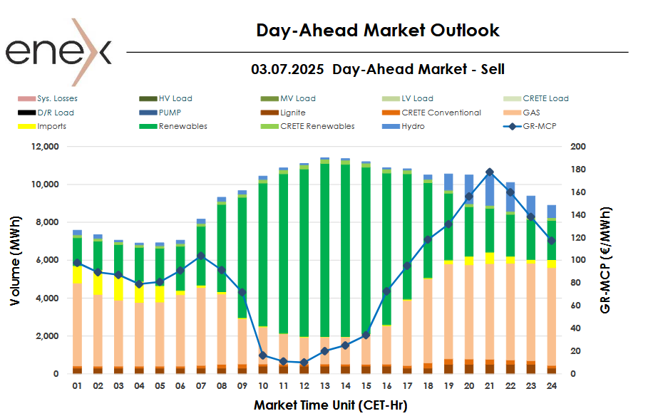 Στα 86,40 ευρώ/MWh διαμορφώθηκε η Τιμή Εκκαθάρισης Αγοράς (ΤΕΑ) της Αγοράς Επόμενης Ημέρας για αύριο 03/7/2025.