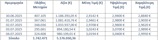 Η «Eurobank Ergasias Υπηρεσιών και Συμμετοχών Ανώνυμη Εταιρεία» («Eurobank Holdings»), σε συνέχεια της από 07.05.2025 ανακοίνωσής της σχετικά με την έναρξη εφαρμογής του Προγράμματος Επαναγοράς Ιδίων Μετοχών («Πρόγραμμα»), που εγκρίθηκε με την απόφαση της Τακτικής Γενικής Συνέλευσης των Μετόχων της Eurobank Holdings στις 30.04.2025 και σε συνέχεια της από 30.04.2025 απόφασης του Διοικητικού Συμβουλίου της, ενημερώνει το κοινό ότι κατά το διάστημα 30/06/2025 – 04/07/2025 απέκτησε συνολικά, στο πλαίσιο του Προγράμματος, 1.742.471 μετοχές εκδόσεως της ιδίας («Ίδιες Μετοχές») που διαπραγματεύονται στο Χρηματιστήριο Αθηνών («Χ.Α.»), με μέση τιμή κτήσης €2,9705, ανά μετοχή και συνολικό κόστος €5.176.030,36.