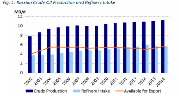 Σύμφωνα με τη Διεθνή Αρχή Ενέργειας (ΙΕΑ), η Ρωσία παράγει περίπου 11,24 εκατ. βαρέλια αργού πετρελαίου ημερησίως το 2016.