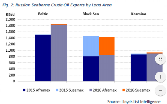 Τα στοιχεία της Lloyds Intelligence καταδεικνύουν ότι τους πρώτους εννέα μήνες του 2016, 4,36 εκατ. βαρέλια αργού πετρελαίου "έφυγαν" από τα ρωσικά λιμάνια, καταγράφοντας αύξηση 8,5% σε σχέση με το αντίστοιχο διάστημα του 2015.
