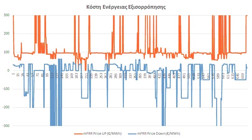 Αντίθετα σε ό,τι αφορά την Ανοδική Ενεργεία Εξισορρόπησης (πορτοκαλί καμπύλη), οι τιμές δεν εμφανίζουν μεταβαλλόμενο πρόσημο και κινούνται σταθερά σε θετικό έδαφος και συνήθως πέριξ των 100 ευρώ/MWh. Υπάρχουν ωστόσο περίοδοι (spikes) που οι τιμές τους πραγματικά εκτοξεύονται σε επίπεδα των 3,000-4,000 ευρώ/MWh.