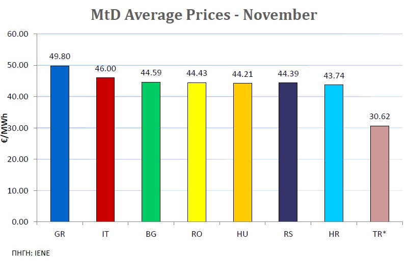 Ξεκινώντας από την Αγορά Επόμενης Ημέρας (ΑΕΗ) που προσομοιάζει με τον άλλοτε Ημερήσιο Ενεργειακό Προγραμματισμό (ΗΕΠ), παρατηρείται μια μάλλον αύξηση στις Τιμές Εκκαθάρισης (ΤΕΑ) σε σχέση με την Οριακή Τιμή Συστήματος που ίσχυε μέχρι 31/10 στο παλαιό μοντέλο του Mandatory Pool. Επίσης οι τιμές παραμένουν συγκριτικά υψηλότερες από των γειτονικών μας χωρών. Ας σημειωθεί εδώ πως η σύζευξη με την Ιταλία και την Βουλγαρία δεν έχει μεν ακόμη ενεργοποιηθεί, ωστόσο το διμερές καθημερινό εμπόριο ηλεκτρικής ενέργειας από τους traders στα όρια των διασυνδέσεων συντελείται κανονικά, με ό,τι αυτό συνεπάγεται για τη σύγκλιση των τιμών στην οποία ούτως ή άλλως ήδη συνεισφέρει.