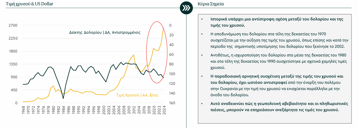 Παρατηρούμε ωστόσο ότι η άνοδος της τιμής του δεν συμβαδίζει με την αποκλιμάκωση του πληθωρισμού, την ενίσχυση του δολαρίου (έως τα μέσα του Ιανουαρίου 2025) και τα επίπεδα των πραγματικών επιτοκίων (κύριοι παράγοντες που επηρεάζουν την τιμή του χρυσού ιστορικά).