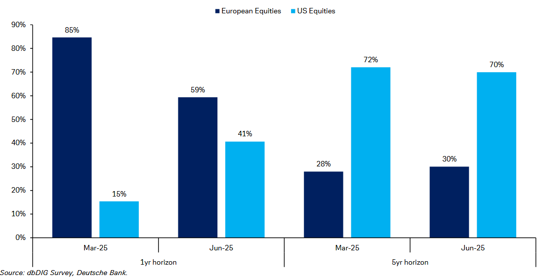 Βραχυπρόθεσμα, για τον επόμενο χρόνο, οι ευρωπαϊκές μετοχές προτιμώνται από το 59% των συμμετεχόντων, αν και αυτό το ποσοστό παρουσιάζει σημαντική υποχώρηση από το 85% που είχε καταγραφεί στην έρευνα του Μαρτίου. Η μετατόπιση αυτή αντανακλά ενδεχομένως ανησυχίες για τον μακροοικονομικό ορίζοντα στην Ευρώπη, τις πολιτικές αβεβαιότητες ή την επίδραση των δασμών.